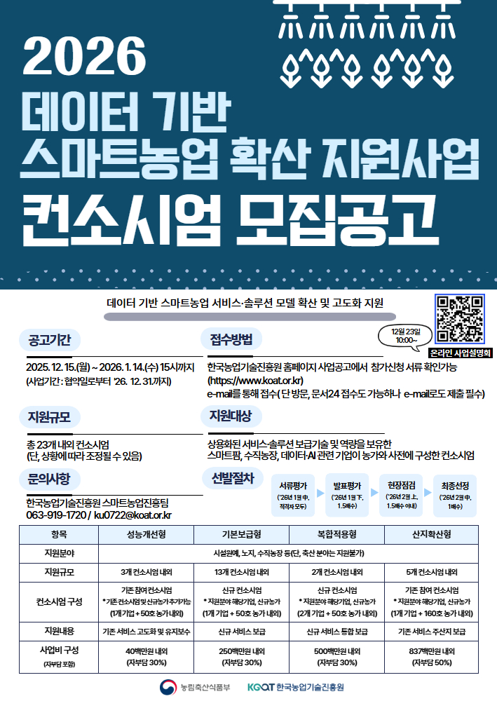 「2026년 데이터 기반 스마트농업 확산 지원사업」컨소시엄 모집 공고 한국농업기술진흥원은 스마트농업의 새로운 혁신성장 동력을 마련하고 농업 데이터 활용 서비스 및 솔루션의 신속한 현장확산을 위해, 「데이터 기반 스마트농업 확산 지원사업」을 추진하고 있습니다. 이 사업에 참여하여 우수한 기술·제품의 현장확산을 희망하는 컨소시엄을 모집하오니, 아래의 사업공고에 따라 적극적으로 지원하여 주시기 바랍니다.