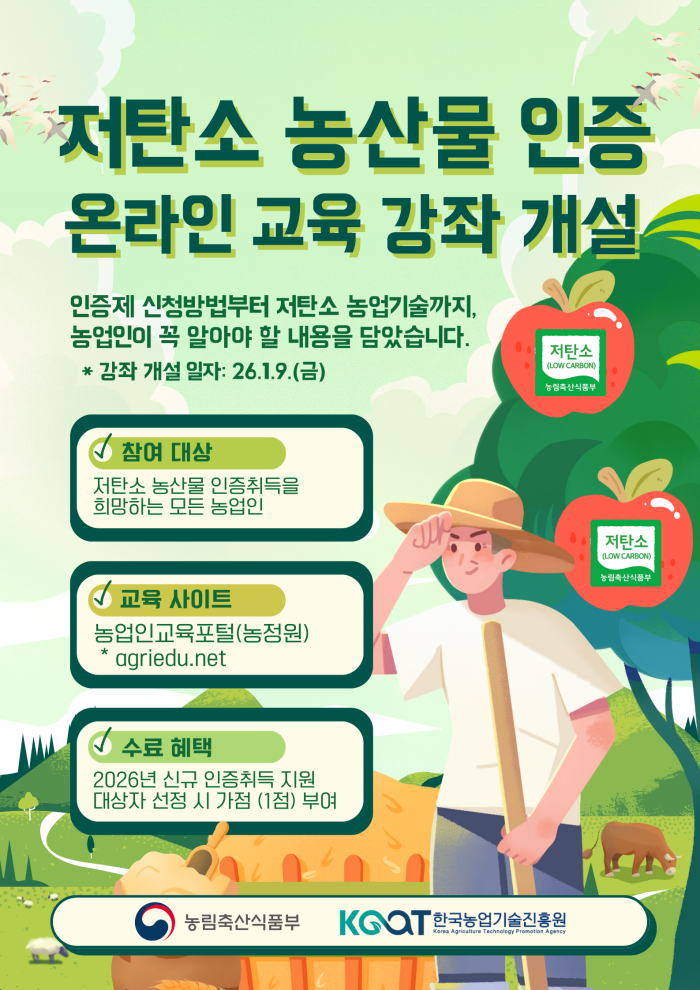 ○ 교육명: 저탄소 농산물 인증 농업인 교육 ○ 교육일자: (개설) 1.9.(금), (운영) 상시운영 ○ 교육대상: 저탄소 농산물 인증취득 희망 농가 ○ 교육내용: 인증제 개요, 신청 절차, 저탄소 농업기술 설명 등(약 1시간 내외) ○ 참여방법: 농업교육포털*(agriedu) 회원가입 > 비대면교육 > 정규과정 > "저탄소" 검색하여 교육 이수 > 수료증 발급 * 농업교육포털 ○ 참여혜택: 2026년 신규 인증취득 지원사업 선정 시 가점(1점) 부여 * 단, 지원사업 신청 시 수료증 등 증빙자료를 제시한 신청인에 한함 ○ 문의: 063-919-1779
