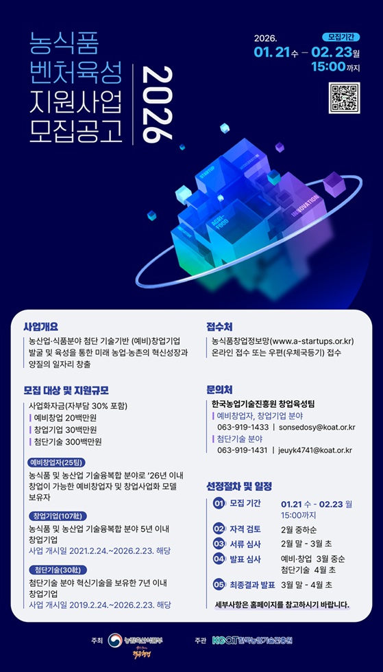 ○ 모집기간 : 2026. 1. 21.(수) ~ 2. 23.(월) 15시까지 ○ 모집대상 : - 첨단기술 분야(스마트농업 및 기타 농식품)의 혁신 기술을 보유하고, 공고 모집 마감일 기준으로 사업 개시일부터 7년을 초과하지 않은 창업기업 (사업개시일이 2019.2.24.~2026.2.23.에 해당) ○ 지원분야 : - 스마트농업 분야 세부 분야 | 관련 분야 | ①-1. 차세대 스마트팜 시스템 | 온실·노지·축산 스마트팜 시스템, 식물공장 시스템, 환경 센서 및 제어 시스템, 기타 스마트팜 기자재 개발·제조 | ①-2. 자동화·무인화 | 자율주행 트랙터, 수확 로봇, 농업용 드론, 위치기반 자동제어 솔루션 | ①-3. 빅데이터·인공지능·클라우드 | 작물·가축 생육모델 분석 서비스, 의사결정 지원 플랫폼, 농장경영 SW, 데이터 기반 온라인 판매지원 플랫폼, 반려동물 관련 학습용 데이터 플랫폼 등 |